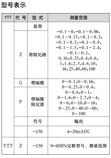 注: 1、产品分为基础,带阻尼器型“Z”,带隔膜型“G”(与)介质接触部分材料为1Gr18Ni9Yi和P2611混练、带隔膜阻尼型“F”。
